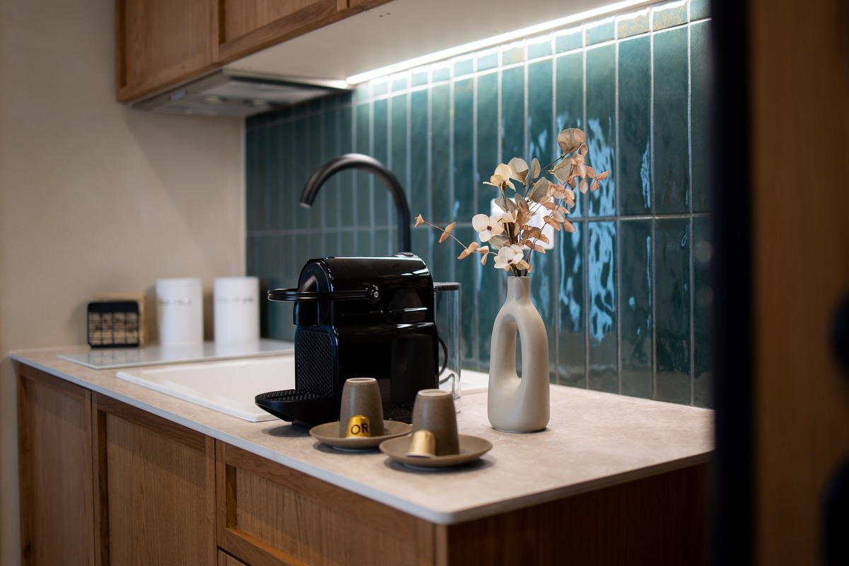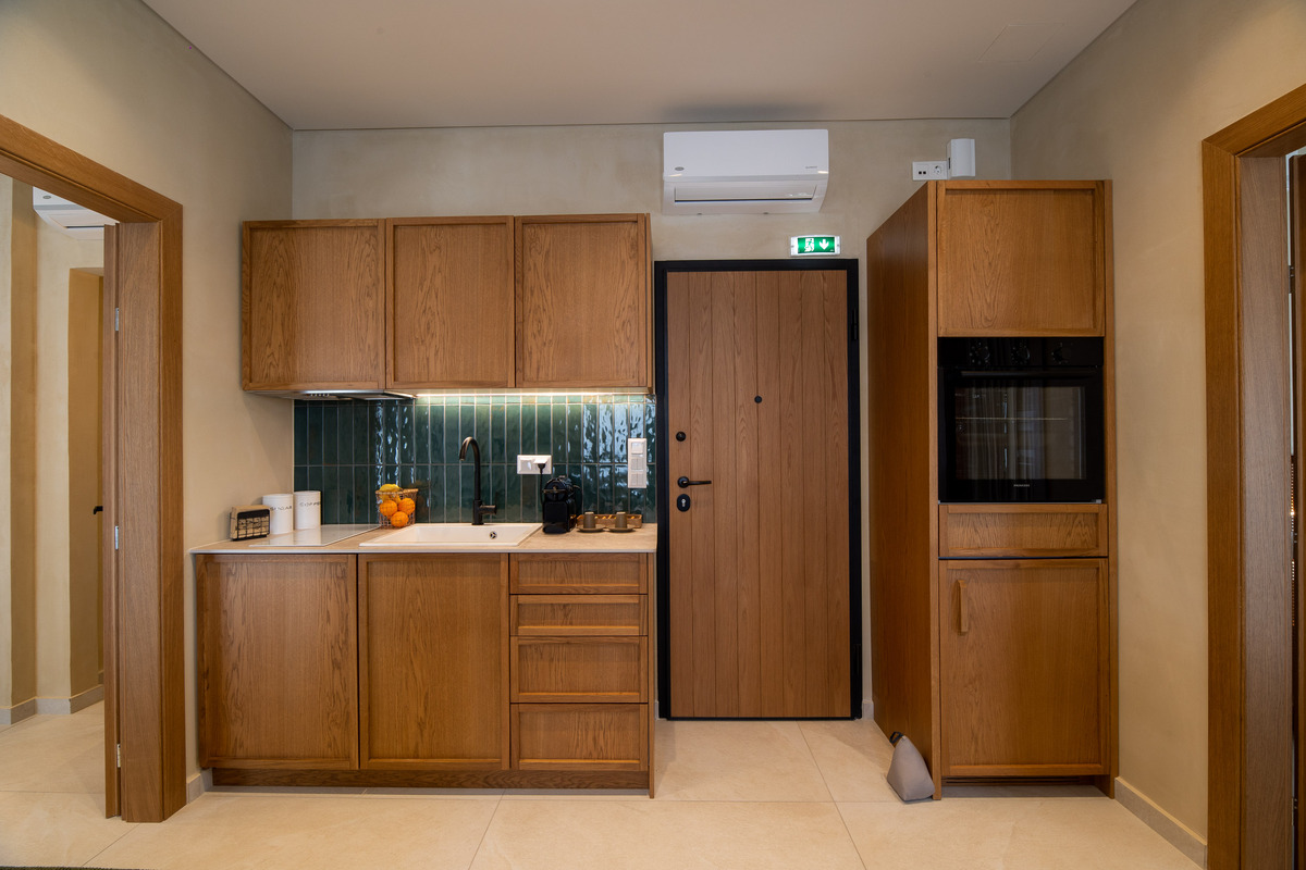 Η πλήρως εξοπλισμένη κουζίνα περιλαμβάνει εστίες, ψυγείο, σκεύη κουζίνας και φούρνο, δίνοντας τη δυνατότητα στους επισκέπτες να προετοιμάσουν τα γεύματά τους με άνεση.